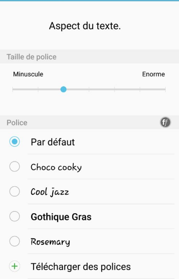Vous pouvez à présent sélectionner la police qui vous convient, ou obtenir d’autres polices en ligne, vous en trouverez beaucoup sur le Play Store.