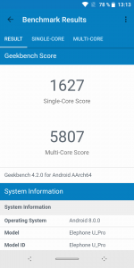 Lors du test de l’Elephone U Pro, les benchmarks ont renvoyés des résultats cohérents avec sa fiche techniques, à savoir un SoC Qualcomm Snapdragon 660, associé à 6 Go de RAM et 128 Go de stockage interne. Pour info, Elephone annonce que le stockage peut être étendu avec une carte SD d’une capacité jusqu’à 1 To ! Ci-dessous vous pouvez retrouver les différents benchmarks réalisés pour ce test de l’Elephone U Pro.