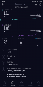 Aucune difficulté en ce qui concerne le Wi-Fi, comme vous pourrez le constater sur les captures ci-dessous, prises lors de ce test du Xiaomi Mi Max 3, ce dernier est bien dual-band. Les speedtests réalisés à plusieurs distances de ma box ADSL sont en adéquation avec les capacités actuelles de ma ligne.