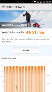 Le Cubot Note Plus a une batterie d’une capacité de 2800 mAh, cette dernière est amovible. Le chargeur fourni a une puissance de sortie de 5V/1A. Le test de performance batterie de PCMark a donné un résultat de 4h51. Un test empirique, consistant à visionner une vidéo sur Youtube pendant une heure a vu la capacité de la batterie décroitre de 20 %. Au final, l’autonomie de la batterie est plutôt bonne au vue de sa capacité, pour autant il faudra la recharger tous les jours. Le rechargement complet de celle-ci prend entre 3h30 et 4h00.