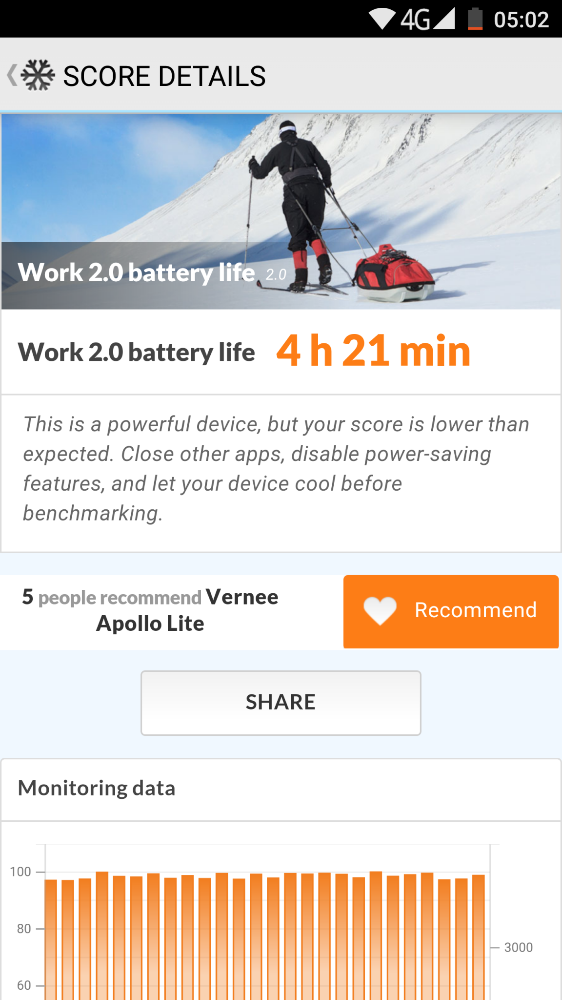 La batterie du Vernee Apollo a une capacité de 3180 mAh (comme celle de l’Apollo Lite) et n’est pas amovible. Le chargeur fourni a une puissance de sortie variable : 5-7-9V/2A et 12V/1.5A. La charge rapide est parfaitement fonctionnelle et heureusement, à noter que l’Apollo a tendance à chauffer lors de la charge ce qui parait normal. Le benchmark batterie de PCMark, effectué deux fois, en réglant la luminosité sur 50% et avec le wifi et le réseau activés a donné une autonomie de 4h21 et de 5h01. Au final, l’autonomie est passable, l’écran 2K, très énergivore étant à coup sûr responsable de cet état de fait.