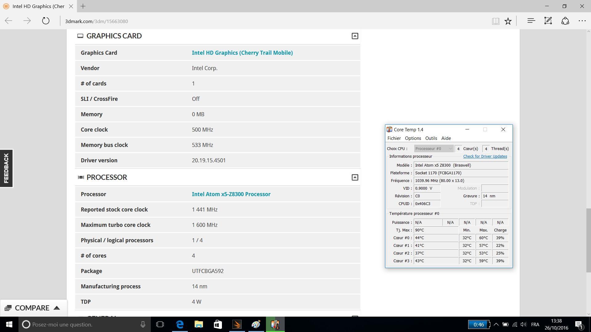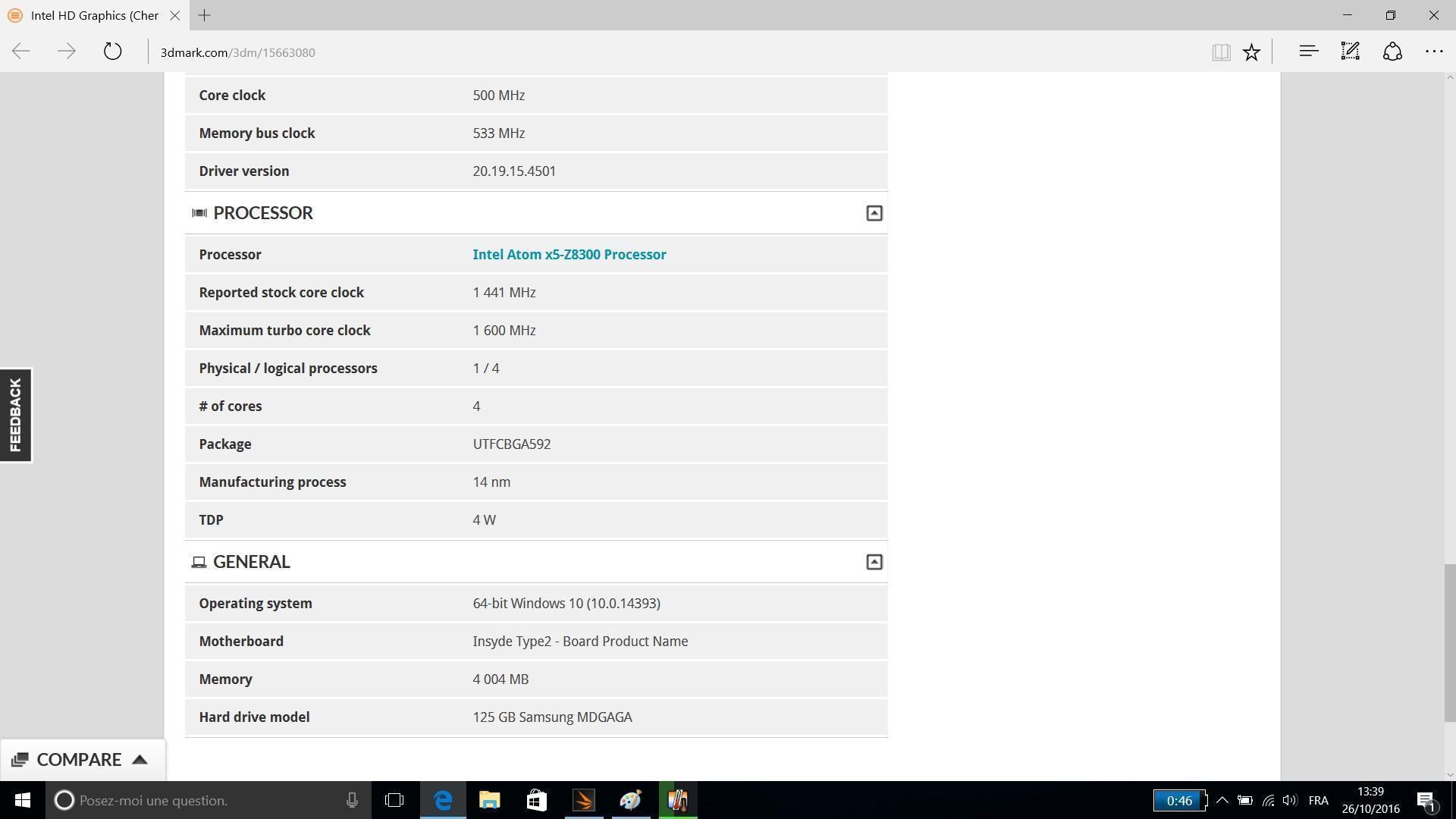 Windows 10 est installé sur la partition de 38GB, et laisse 80GB libres sur une seconde partition. Pas de SSD sur ce modèle, mais un eMMc reconnu comme étant de marque Samsung.